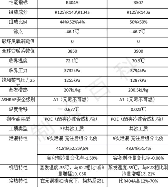 2R404aR507的壓力溫壓表上的數據表明,二者之間的壓力幾乎相同,,如果大家平時留意下用的系統配件,會發現熱力膨脹閥上的標示說明是R404aR507共用的。