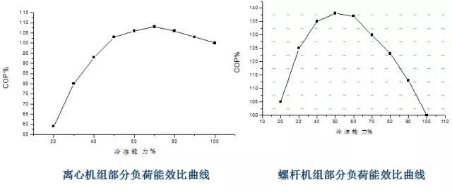 離心機和螺桿機的耗電量較大,但在相同制冷量情況,螺桿機部分負荷時能效要高于離心機組的部分負荷能效。以總冷量為5632Kw1600冷噸),如果采用3臺機組,每臺冷量約為650冷噸。