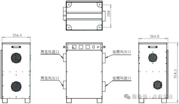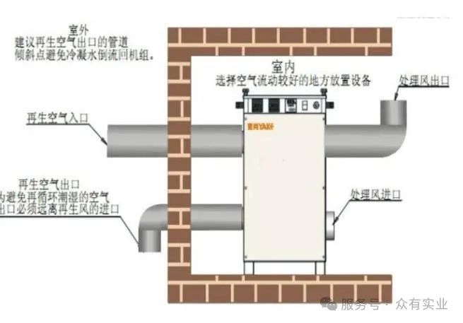 除濕機置于室外:干空氣出口和處理空氣進口連接到除濕區(qū)域。再生風入口和濕空氣出口不需要連接管道。