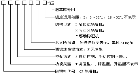 型號(hào)示例: CFZF20-YC 表示名義除濕量為20kg/h,進(jìn)風(fēng)溫度1832℃,固定式自動(dòng)調(diào)溫型煙草庫(kù)專(zhuān)用除濕機(jī)組。